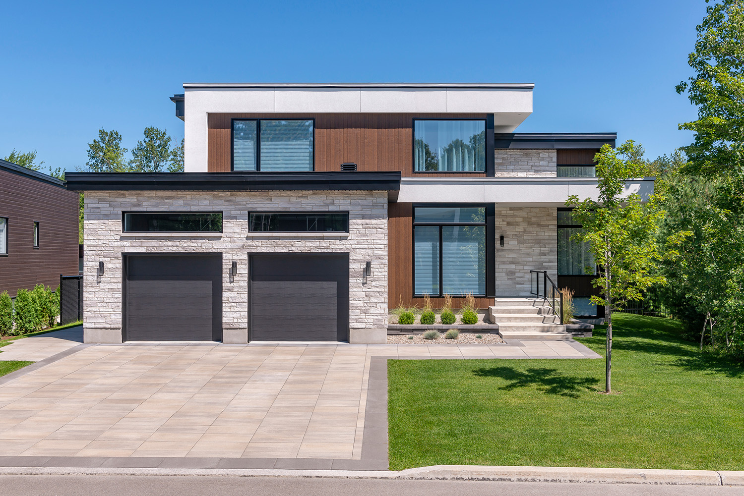 High-contrast color patterns are becoming a defining feature of modern exterior siding ideas. Pairing light stone or masonry with darker siding creates visual separation and highlights architectural elements without overcomplicating the design. This trend is commonly seen where black, charcoal, or deep brown accents are combined with lighter exterior siding options to frame windows, entryways, or vertical sections of the façade.